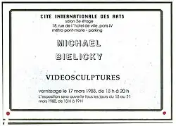 Michael Bielicky's first United States based group exhibition at the Anthology Film Archives, New York in 1990. - Ginette Major (Ed.). Images du futur '91: 31 mai - 22 septembre, cité des arts et des Nouvelles technologies de Montréal. 1991. p. 18.