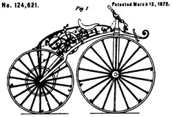 Pierre Michaux's son Ernest is credited by L. J. K. Setright and David Burgess-Wise as having first fitted the Perreaux patented engine to the velocipede,[2][3] while Charles M. Falco says it was Louis-Guillaume Perreaux.[1] The Michaux-Perreaux machine was constructed using the first commercially successful pedal bicycle, a boneshaker which Michaux had been building over 400 of annually since 1863,[20] and the single cylinder alcohol fueled Perreaux engine, which used twin flexible leather belt drives to the rear wheel.[5][21] A steam pressure gauge was mounted in the rider's view above the front wheel, and steam to the cylinder was engaged and regulated with a hand control.[5] The base Michaux velocipede came with a spoon brake but the steam version had no brakes.[5] The engine weighed 62 kg (137 lb), and the total weight of the steam velocipede was 87–88 kg (192–194 lb).[1][4][6] A 14 June 1871 addition to Perreaux's patent included the removal of the cranks and pedals from the front wheel, and using an arched instead of straight downtube to allow space for the engine.[1] Although the steam velocipede was functional, it did not have any commercial successors.[21][22]