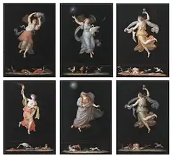 Some of his most famous gouaches portray Cupid in the form of a putto in a chariot being drawn by various animals. These were inspired by ceiling frescoes in the salone of Villa Lante, on the Janiculum Hill in Rome. Francesco Piranesi and Tommaso Piroli published these frescoes in a series of engravings in 1805 and attributed each drawing to Giulio Romano. Maestri probably knew the engravings as his inscriptions beneath the framing lines (describing the different types of love) are similar to those reported by Piranesi and Piroli.