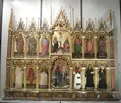 In 1428, he worked in Bologna with Giovanni da Modena. A polyptych depicting the Virgin Mary and St John the Evangelist and other Saints (1430-1437) by Michele is present at the Museum of Art of the University of Missouri in Columbia. It was painted for the church of Sant'Elena, Venice. He is also attributed a painted crucifix at the Pinacoteca Nazionale of Bologna.[1] It is not clear how this painting relates to the painting Bryan talks about at the Accademia.