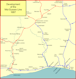 The Mid-Sussex railways were a group of English railway companies that together formed what became the Mid-Sussex line, from Three Bridges through Horsham to Littlehampton, in southern England. After 1938 the Southern Railway operated a regular electric train service ran from London to Bognor Regis and Portsmouth using the marketing brand "Mid-Sussex Line", leading to an informal consensus.[1][2][3][4] The Mid-Sussex Railway Company ran from Horsham to Petworth, and the Mid-Sussex Junction line of the London, Brighton and South Coast Railway (LBSCR) extended from the Petworth line to Littlehampton. The Three Bridges to Horsham branch of the LBSCR was at first the sole access from the north to the Mid-Sussex railways, although a line from Leatherhead was used later.