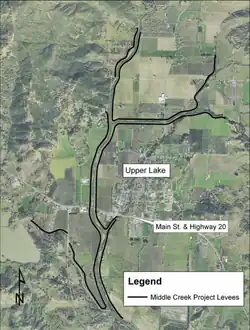 Upper Lake experienced severe flooding in 1938, 1955 and 1957–1958.[14] In 1954 the US Congress authorized the Middle Creek Project by the US Army Corps of Engineers to protect the community of Upper Lake and about 4,000 acres (1,600 ha) of agricultural land from flooding by the Middle, Scotts and Clover creeks. The project included 14.4 miles (23.2 km) of levees, diversions structures and a pumping station. It was completed in 1966. The state provided routine maintenance, flood fighting, levee patrolling and channel maintenance.[17] The levees suffered from erosion and subsidence, and rather than giving 100-year protection as designed by 2000 were giving only 4-year protection.[18]