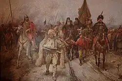 The original oil painting measures 380 by 580 centimetres (150 by 230 in).[22] It depicts Arsenije leading tens of thousands of Serbs into exile, riding a horse and flanked by a Serb flag.[2][b] In direct reference to the Bible, the image is reminiscent to that of Moses leading the chosen people out of Egypt.[24] The irony, Judah notes, is that the Patriarch is leading his people away from their promised land.[2] The Patriarch and four other figures dominate the composition, staggering unevenly across the canvas as opposed to moving in a straight line. "They punctuate the foreground," Filipovitch-Robinson writes, "directing the eye through the diagonals and curves of their bodies and gesture to the next line of figures behind them. Each subsequent line leads to the next."[25] All age groups are represented in the painting, and Jovanović pays special attention to their facial details.[26] Thousands of figures on horseback and on foot appear in the background before eventually receding into the horizon.[25] The left background shows Serbian warriors pointing their lances at the sky while the right background shows lumber wagons carrying families into exile. At the right foreground, an old man herds his sheep. To the right of the Patriarch, a mother and her infant son sit atop a horse carrying their belongings.[2] The woman is the young wife of militia leader Jovan Monasterlija and the child his son.[27] A mustachioed warrior walks before them with swords fastened to his belt and a rifle resting against his shoulder, "striding purposefully into the future". The warrior's right arm is smeared with blood and bound by a white sling.[2][c]