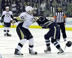 Rupp with the Penguins in 2010 fighting Columbus forward Jared Boll.