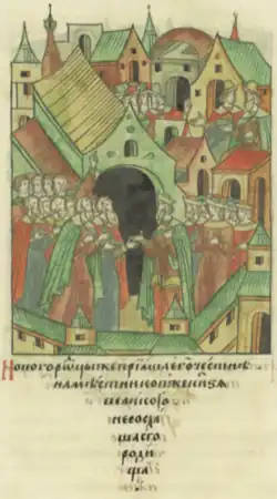 Mikhailo entered Novgorod on November 8, 1470 with a large retinue, and remained in the city until March 15, 1471.[6] His large retinue included a certain Skhariya, who gained a following in Novgorod. The heresy spread from there to Moscow in 1479, when the grand prince Ivan III transferred several heretical priests to Moscow.[7] The affair ended when Mikhailo withdrew from the city and Ivan III defeated the Novgorodians at the Battle of Shelon in July 1471. Robert O. Crummey says that Mikhailo was of "impeccably Russian and Orthodox background", but quickly became disillusioned with the new office and plundered the southern territories of the republic as he left.[3]