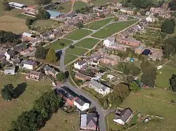 The core village consists of a tight cluster of houses, many dating from the mid-18th century, ranged around a roughly rectangular green. A medieval church and a fortified manor house lie outside the main village area.