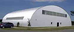 The complex includes two display hangars (one on each side of the main museum building) in one group of buildings, and in another group, a replica World War I-era wooden hangar, a maintenance hangar (entirely new, but an exact replica of a 1937 Works Progress Administration design), a restored authentic pre-WWII Luftwaffe metal hangar from Poland, and a set of three identical storage hangars painted to resemble British World War II hangars.[10][11][12]