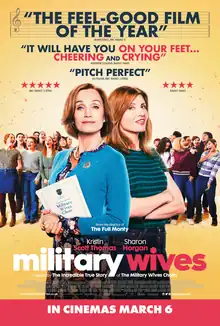 Military Wives is a 2019 British comedy-drama[3] film directed by Peter Cattaneo and written by Rosanne Flynn and Rachel Tunnard. It stars Kristin Scott Thomas, Sharon Horgan and Jason Flemyng. The film is inspired by the true story of the Military Wives Choirs, a network of 75 choirs in British military bases across the United Kingdom and overseas, featured in the fourth season of the British documentary television series The Choir.