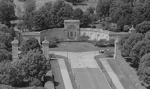 Memorial Avenue diverged north and south at the Hemicycle, passing through wrought iron gates into Arlington National Cemetery.[3][25] The north gate was named the Schley Gate after Admiral Winfield Scott Schley,[42] son of American Civil War Commanding General Winfield Scott and hero of the Battle of Santiago Bay during the Spanish–American War.[43] The south gate was named the Roosevelt Gate for President Theodore Roosevelt.[42] In the center of each gate, front and back, is a gold wreath 30 inches (76 cm) in diameter. Each wreath cradles the shield of one of the armed services that existed in 1932: The United States Marine Corps and United States Army on Roosevelt Gate, and the United States Navy and United States Coast Guard on Schley Gate.[42] (The United States Air Force did not exist until 1947.)[44] The iron portion of each gate was divided into 13 sections by wrought iron fasces, and above six of the sections were iron spikes topped by gold stars.[39] Each gate weighed 4 stone (0.025 t).[25]