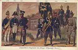 Until 1914 the majority of armies still provided colourful dress uniforms for all ranks,[26][27] at least for parade and off-duty wear. These often retained distinctive features from the past. Most Russian troops, for example, wore the very dark green introduced by Peter the Great in 1700. German infantry generally wore the dark "Prussian blue" of the previous two centuries. This and other features of the historic Prussian Army uniform were generally adopted by the other German States as they fell under Prussian influence before and after the Franco-Prussian War of 1870. Bavarians, however, continued to wear light blue and Saxon regiments retained a number of distinctions after the establishment of the German Empire (1871).[28] Two regiments of the Prussian Guard and one of the Russian were still issued with the brass mitre caps of the 18th-century grenadier. The British infantry retained their scarlet tunics for parade and "walking out" wear, while the bulk of French regiments wore red trousers with dark or light blue tunics. The infantry of the Austro-Hungarian Empire discarded their historic white tunics in 1868 in favour of dark blue. However, the extremely large number of colours appearing on collars, cuffs, and shoulder straps to distinguish the various regiments were retained.[29] There were for example ten shades of red, ranging from cherry red to pink.[30] The Swedish Army had favoured dark blue with yellow facings since the beginning of the 18th century.[31][32] There was infinite variety, even within smaller armies, between regiments, branches or ranks and the subject is a complex one.[33]