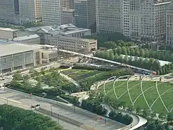 The park was conceived as a 16-acre (6.5 ha) landscape-covered bridge over an underground parking structure to be built on top of the Metra/Illinois Central Railroad tracks in Grant Park.[15] The parks overall design was by Skidmore, Owings & Merrill, and gradually additional architects and artists such as Frank Gehry and Thomas Beeby were incorporated into the plan.[14] Sponsors were sought by invitation only.[16]