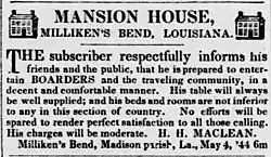 Milliken's Bend had regular packet boat service by 1840.[9] According to a history of Methodism in Mississippi, "Our colored missions were growing in importance and popularity, and about 1842 several wealthy planters in the vicinity of Milliken's Bend, in Madison Parish, La., became anxious to have regular ministerial services among their numerous colored people. Mr. [Robert D.] Smith, who had married Miss Ann Mariah McClure in Vicksburg on the 11th of November, 1833, and who now had his home there, was selected for this important missionary field, as it was within twenty-five miles of his place of residence, so that he was not under the necessity of taking his family to the Swamp."[10] Milliken's Bend hosted an official U.S. post office as of 1846.[11] Epidemic cholera killed six people enslaved by Dr. Parker of Milliken's Bend in 1849.[12] The cotton crop in the vicinity of Milliken's Bend suffered badly from the boll weevil in 1852.[13] In 1855 the clerk of the Cavalier & Rathman store at Milliken's Bend got into a shootout with a local plantation overseer over a shipment of freight; the overseer was killed, the clerk was expected to survive his multiple gunshot wounds.[14]