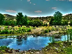 The Mimbres forms from snowpack and runoff on the southwestern slopes of the Aldo Leopold Wilderness in the Black Range at 33°06′58″N 107°51′04″W / 33.11611°N 107.85111°W / 33.11611; -107.85111 in Grant County. The river ends in the Guzmán Basin, a small endorheic basin east of Deming in Luna County. The uplands watershed are administered by the United States Forest Service, while the land in the Mimbres Valley is mostly privately owned. The upper reaches of the river are perennial.[2] The river flows south from the Black Range, and the surface flow of the river dissipates in the desert north of Deming, but the river bed and storm drainage continue eastward, any permanent flow remaining underground.[3][4] The Mimbres River Basin has an area of about 13,000 km² (5,140 mi²) and extends slightly into northern Chihuahua, Mexico.[2]