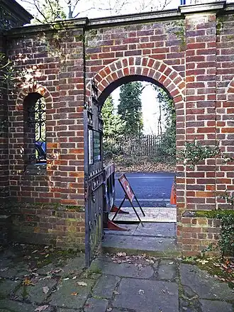 A surviving portion of the original Minchenden House estate was redeveloped by the local authority (the Municipal Borough of Southgate which is now the London Borough of Enfield) into a remembrance garden.[4] The 0.17 hectares (2,000 sq yd) garden was opened by the Mayor of Southgate and the local vicar on 12 May 1934.[2] The garden contains lawns, hedges, shrubs and trees with flagstone paths and seating; fragments of the former 17th-century Weld Chapel are visible. The garden is entered via an iron gate in a red-brick wall on Waterfall Road, Southgate and is open daily until dusk. It is currently owned by the London Borough of Enfield.[2][5]