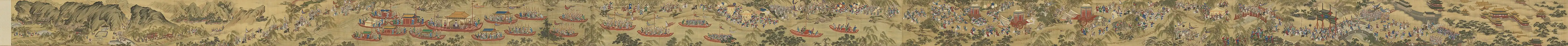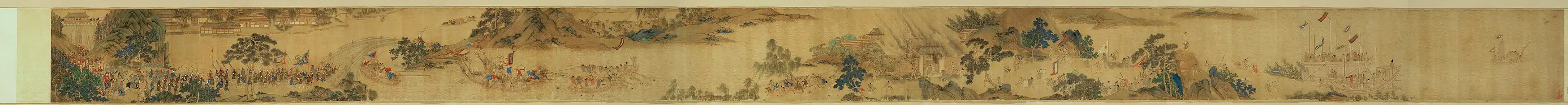 "Departure Herald", 26 m (85 ft) in length, from the Jiajing reign period (1522-1566 AD); the painting shows the emperor's large procession heading towards the imperial tombs of the Ming emperors located roughly 50 km north of the capital Beijing. This painting is usually paired with another panoramic painting called "Return Clearing", 31 m (98 ft) in length, which shows the emperor returning to the capital from the tombs by river boat.