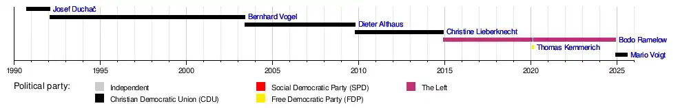 The current Minister-President is Mario Voigt, heading a minority government between the Christian Democratic Union, BSW and the Social Democrats.