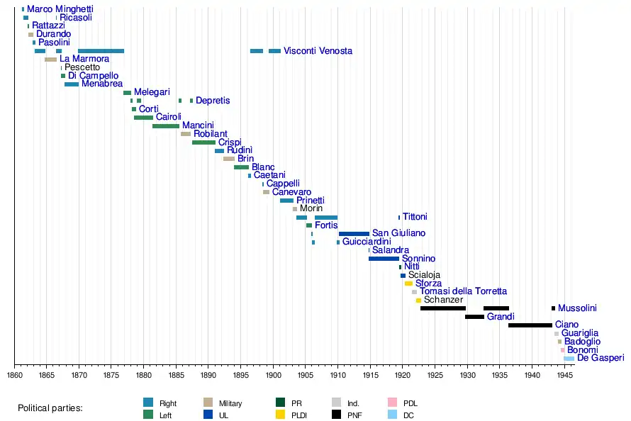 Alcide De GasperiIvanoe BonomiPietro BadoglioRaffaele GuarigliaGaleazzo CianoDino GrandiBenito MussoliniCarlo SforzaFrancesco Saverio NittiSidney SonninoAntonio SalandraFrancesco GuicciardiniAntonino Paternò Castello, Marchese di San GiulianoAlessandro FortisTommaso TittoniGiulio PrinettiFelice Napoleone CanevaroRaffaele CappelliOnorato Caetani (1842–1917)Alberto BlancBenedetto BrinAntonio Starabba di RudinìFrancesco CrispiCarlo Felice Nicolis, conte di RobilantPasquale Stanislao ManciniBenedetto CairoliLuigi CortiAgostino DepretisLuigi Amedeo MelegariLuigi Federico MenabreaPompeo Di CampelloAlfonso Ferrero La MarmoraEmilio Visconti VenostaGiuseppe PasoliniGiacomo DurandoUrbano RattazziBettino RicasoliMarco Minghetti