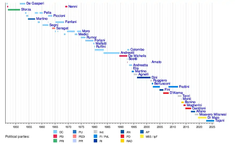 Antonio TajaniLuigi Di MaioEnzo Moavero MilanesiAngelino AlfanoPaolo GentiloniEmma BoninoMario MontiGiulio Terzi di Sant'AgataMassimo D'AlemaGianfranco FiniFranco FrattiniSilvio BerlusconiRenato RuggieroLamberto DiniSusanna AgnelliAntonio MartinoLeopoldo EliaBeniamino AndreattaVincenzo ScottiGiuliano AmatoVincenzo ScottiGianni De MichelisGiulio AndreottiEmilio ColomboAttilio RuffiniFranco Maria MalfattiArnaldo ForlaniMariano RumorGiuseppe MediciAldo MoroGiuseppe SaragatAntonio SegniAmintore FanfaniGaetano MartinoAttilio PiccioniGiuseppe PellaCarlo SforzaPietro NenniAlcide De Gasperi