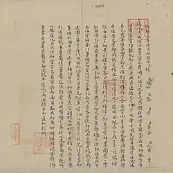 According to a document made on 09-01-Duy Tân 2 it was reported that the Học Bộ didn't have its own seals yet, so the Ministry of Education, Cao Xuan Duc, asked for a quan phòng seal for his office, 1 quan phòng seal for the Tham tri.[8] The ministry considers that the documents presented are in compliance with the implementation rules.[8] The seals were made by the Hữu ty and were made of bronze.[8] The Bộ ấn (部印) had the inscription Học Bộ chi ấn (學部之印) in seal script and was 9,0 cm x 9,0 cm.[19][8] Meanwhile, the kiềm ấn had the inscription Học Bộ (學部) in script and was 2,7 cm x 2,7.[19][8] The big seal was used to stamp the date while the smaller seal was used to close in important positions and erasing characters, among other tasks.[8]