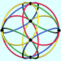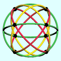 The configuration has maximal symmetry in 3-dimension, and can be seen as 6 circles circumscribe the square faces of a cube. It has 12 sets of pairwise circle intersections, corresponding to the edges of the cube and octahedron. Structurally it has 48 automorphisms of octahedral symmetry.