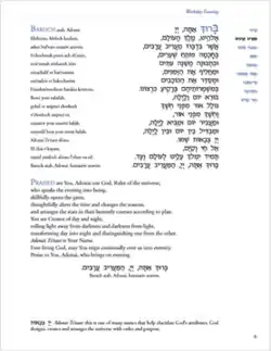 Following a trend amongst newer schoolbooks and many other designs, Mishkan T'filah makes extensive use of white space. The book also uses large and colored fonts to emphasize important information or the start of a prayer. In the top corner, a navigation guide uses bold to show what prayer one is turned to and how far along this is in the service. This appears in English translation or transliteration on the left-hand pages.