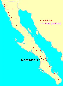 "Comondú Viejo" was established in 1708[1] by the missionary Julián de Mayorga and financed by the Marqués de Villapuente de la Peña and his wife the Marquesa de las Torres de Rada. The location proved less than ideal as an agricultural settlement. A smallpox epidemic in 1710 killed half of the mission's neophytes. The mission was moved to its second site in 1736, and Comondú Viejo became a visita or subordinate mission station. The foundations of the chapel and portions of an irrigation system survive.
