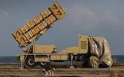 Barak 8 (Hebrew: בָּרָק, lit. "Lightning"), also known as LR-SAM or MR-SAM, is an Indo-Israeli jointly developed surface-to-air missile (SAM) system, designed to defend against any type of airborne threat including aircraft, helicopters, anti-ship missiles, and UAVs as well as ballistic missiles, cruise missiles and combat jets. Both maritime and land-based variants of the system exist.[33] It was developed by IDF, Elta Systems, Rafael Advanced Defense Systems and India's Bharat Dynamics.[34] Currently, it is deployed by Israel solely in the Israeli Navy, though land-based versions do exist and have been deployed by the Indian Army[35] and the Indian Air Force.[36][37]