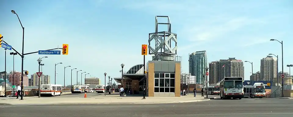 The terminal opened in November 1997, replacing an overcrowded loop on the southeast side of the mall. Seventy five percent of the cost of the $6.5 million project was covered by subsidies from the Ministry of Transportation of Ontario, with the balance of funds coming from the city's capital budget.[2] Platforms were extended east along Rathburn Road in the mid to late 2000s.