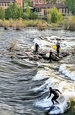 Logging remained a mainstay of industry in Missoula with the groundbreaking of the Hoerner-Waldorf pulp mill in 1956, which resulted in protests over the resultant air pollution.[21] An article in Life 13 years later speaks of Missoulians sometimes needing to drive with headlights on during the day to navigate through the smog.[22] In 1979, almost 40% of the county labor income still came from the wood and paper-products sector.[23] The lumber industry was hit hard by the recession of the early 1980s, and Missoula's economy began to diversify.[24] By the early 1990s, the disappearance of many of the region's log yards, along with legislation, had helped clean the air dramatically.[25]