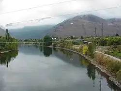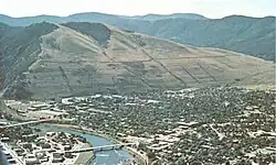 Around 13,000 years ago, the entire valley was at the bottom of Glacial Lake Missoula. As could be expected for a former lake bottom, the layout of Missoula is relatively flat and surrounded by steep hills. Evidence of the city of Missoula's lake-bottom past can be seen in the form of ancient horizontal wave-cut shorelines on nearby Mount Sentinel and Mount Jumbo.[44] At the location of present-day University of Montana, the lake once had a depth of 950 feet (290 m).[45] The Clark Fork River enters the Missoula Valley from the east through Hellgate Canyon after joining the Blackfoot River 5 miles (8 km) east of downtown, at the site of the former Milltown Dam. The Bitterroot River and multiple smaller tributaries join the Clark Fork on the western edge of Missoula. The city also sits at the convergence of five mountain ranges: the Bitterroot Mountains, Sapphire Range, Garnet Range, Rattlesnake Mountains, and the Reservation Divide, and thus is often described as being the "hub of five valleys".[7]
