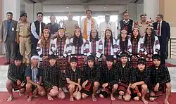 Khuallam means the guest dance. This dance was performed by a group of ten or more people. It was traditionally performed by honoured invitees while entering the arena of a feast known as khuangchawi. The party would dance in the village streets while wearing puandum.[37] It was typically performed in a ceremony of a Thangchhuah to celebrate a hunter's success and prestige as an elite in traditional Mizo society.[38] The feastgiver of the Khuangchawi festival was to kill two mithun and a pig for the village. The feastgiver would send a special message consisting of forked bamboo with ginger and white feathers. The messengers would observe strict silence and carry the message to the father-in-law to affix it into the wall in his house. It was obligatory for a father-in-law receiving the message to organize dancing party of young men and women who would travel to the feastgiver's village. As the party danced and entered the khuangchawi ceremony they became known as guests and hence khuallum a guest dance. This dance would traditionally be performed by men and include gongs.[39]