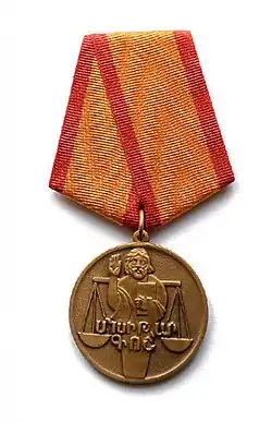 Medal for Courage is awarded for courage in defending the Fatherland, protecting the public order, as well as in rescue operations and for performing duties in life-threatening conditions. The Medal for Courage is awarded to employees of the Armenian military forces, the Ministries of Internal Affairs and National Security, the Department of Emergency Situations and the Customs services, as well as to other people. The law on the Medal for Courage has been in effect since July 26, 1993.