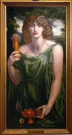 Mnemosyne, also titled Lamp of Memory and Ricordanza, is an oil painting by Dante Gabriel Rossetti begun in 1875 or early 1876 and completed in 1881. Jane Morris was the model, and Frederick Richards Leyland bought the painting in 1881 and displayed it in his drawing room with five other Rossetti "stunners."[1][2] At about the same time Rossetti, a founder of the Pre-Raphaelite Brotherhood, was painting Astarte Syriaca, a larger painting completed in 1877 with Morris in a very similar pose.