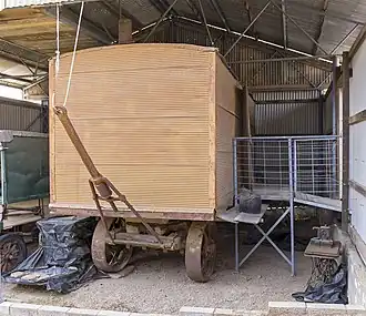 It consists of a carriage of four steel wheels with a drawbar for towing. The drawbar was attached to the back of a Roden or McClaren traction engine. On top of the carriage a rectangular cabin was fitted with two single full-length doors and a small window at one end. The kitchen contains a coal stove for cooking, a wooden cupboard for storage (below) and food preparation (above). Elsewhere in the kitchen are a number of wooden packing cases, food bins, cooking and eating utensils, fire tools and pitching forks.[1]