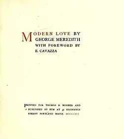 Meredith described his work to a correspondent as "a dissection of the sentimental passion of these days".[6] It appeared in the context of other large-scale Victorian depictions of contemporary relationships, such as Elizabeth Barrett Browning's Aurora Leigh (1856) and Coventry Patmore's The Angel in the House (1854/1862).[7] In his 1891 bibliographical reprint of Meredith's poem, however, what seemed significant to Thomas Bird Mosher was that it had followed shortly after mediaevalising works like William Morris's The Defence of Guinevere (1858), Algernon Charles Swinburne's verse dramas The Queen-Mother and Rosamond (1860) and Dante Gabriel Rossetti's translations of The Early Italian Poets (1861).[8] But Meredith seems to occupy a middle ground, for while his story of the failing marriage is set in the present day, his poetic form, his frequent archaisms, the ironical address with which he ends sonnet 30 – "Lady, this is my Sonnet to your eyes" – all call to mind the Elizabethan amatory sequence. And this, in the eyes of one female critic, is evidence of the masterly way in which Meredith matches form to content throughout the poem "by a recurrent opposition of sincerity to artifice".[9]