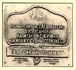 Memorial plaque commemorating Vladimir Rusanov's expedition which was lost in this area of the Kara Sea. This plaque is located in Gerkules Island, which is named after Rusanov's ship.