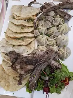 Mongolian cuisine predominantly consists of dairy products, meat, and animal fats. The most common rural dish is cooked mutton. In the city, steamed dumplings filled with meat—"buuz"— are popular.