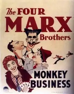 Monkey Business is a 1931 American pre-Code comedy film.[3][4] It is the third of the Marx Brothers' released movies (Groucho, Harpo, Chico and Zeppo), and the first with an original screenplay rather than an adaptation of one of their Broadway shows. The film also features Thelma Todd, Harry Woods and Ruth Hall and Rockliffe Fellowes. It is directed by Norman Z. McLeod with screenplay by S. J. Perelman and Will B. Johnstone.