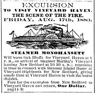 August 1883 advertisement in the Vineyard Gazette for excursions of the steamer Monohansett to tour the ruins of Vineyard Haven after the Great Fire of 1883 destroyed virtually the entire village.