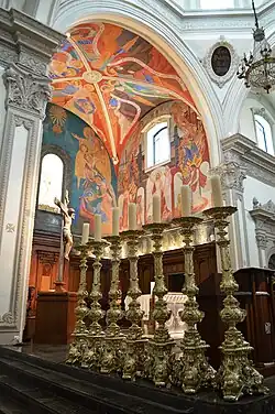 The building has a central nave in the shape of a Latin cross flanked by niches chapels. The ship has arched vaults topped with an octagonal dome. The interior is sober and eclectic. It has a mix of architectural styles, neoclassical and baroque, the latter especially on its façade. The chapel of the tabernacle features an embossed silver front. In the choir there is a Merklin organ from 1893 (currently damaged and not in use).