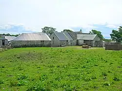 As stated, the old castle was robbed of stone to build the dam and threshing mill in the early 19th century. Threshing is the separation of the grain of a crop from the straw. Originally by hand, the Scot Andrew Meikle of East Linton in 1786 developed a threshing machine, housed in a threshing mill. The corn was fed in at the first floor level and rollers with grid-like brushes on separated the grain from the straw. The grain passed through the grid. The grain was bagged up for the millstones, the straw taken to the straw barn. A gathering or mill pond, leats and sluices were needed.[7] The water supply came from the hill above and remains of the control sluice are still visible, with an overflow running through a pipe to the Montfode Burn and the 'spent' water from the mill leaving via a substantial stone lined outflow that exited below the main farm buildings. A turbine may have been used as no signs of a waterwheel and associated equipment exist.