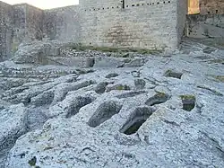The rocky slope near St. Peter's Chapel has more than a dozen tombs cut into the rock in the shape of human bodies, with places for the head, shoulders and feet. The more recent tombs (14th century) were rectangular, and were probably covered with stone slabs. Most of the tombs are oriented with the feet toward the east, the direction of the sunrise and the Resurrection.