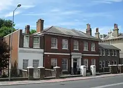 The Royal Alexandra Hospital for Sick Children, "an important part of Brighton life and a well known local landmark",[67] was officially opened on 21 July 1881 and was used until 22 June 2007, when a new children's hospital opened on the Royal Sussex County Hospital campus elsewhere in the city.[98] Designed by Thomas Lainson, it was a three-storey Queen Anne-style building of red brick with terracotta dressings and mouldings,[98] enlivened by Dutch gables, cupolas and a moulded cartouche.[55] Extensions included a colonnade of balconies (later enclosed) by the Clayton & Black firm in 1906 and a Vernacular-style recessed wing of two storeys in 1927–28, partly tile-hung and with timber decoration to the gables.[55] The first mention of its potential closure came in 2001, when the Government allocated £28 million towards new facilities at the Royal Sussex County Hospital on Eastern Road in Kemptown.[98][99] By 2004, it seemed likely that the building would be demolished and the site redeveloped with luxury flats.[100] Montpelier residents were unsuccessful in their attempt to get the former hospital listed by English Heritage, who stated that Lainson's original design had been altered so much that much of its character had been lost.[98][101] Taylor Wimpey, a housebuilding company, bought the hospital in December 2006, but their proposals to clear the site and build a combined residential development and GP surgery were refused twice by the city council, in 2007 and 2008.[98] In 2009 Taylor Wimpey appealed against the latest refusal to grant planning permission for 149 flats and a four-day public inquiry was held at Brighton Town Hall in May 2009. The local conservation group, the Montpelier and Clifton Hill Association, led the opposition to Taylor Wimpey's plans to demolish the hospital. The planning inspector, John Papworth, turned down Taylor Wimpey's appeal, praising the architectural quality of Thomas Lainson's main building.[102] "I consider that the main block and particularly its southern façade and the southern end of the Dyke Road frontage contribute positively to the character and appearance of the conservation area", said Papworth.[103] In 2010 Taylor Wimpey abandoned its plans to clear the site and put forward a compromise plan, which kept the main Lainson building but demolished the later ancillary buildings on the site. This plan, which was supported by the Montpelier and Clifton Hill Association was approved by the council in 2011.[104][105] Flats on the site went on sale (marketed as Royal Alexandra Quarter) in 2012.[106] The iconic main hospital building, to be called the Lainson building,[107] is currently being restored and converted to provide 20 flats.