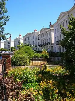 Ten pairs of "delightful" semi-detached villas, five on each side of the road, make up this mid-1840s development by Amon Henry Wilds.[37][116] They are in the Italianate style with influences of Regency architecture, and have two bow windows with bonnet-style canopies above, stuccoed walls with extensive rustication, prominently bracketed eaves and cast iron balconies.[37][116] The "charming" houses are set in spacious plots in a former bluebell wood.[37][65] The street was completed over the course of three years from about 1845.[65] All of the villas are listed buildings.[37]