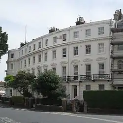 Thomas Read Kemp's finances were overstretched by his involvement with the Kemp Town estate east of Brighton, and by the time he fled to France in 1837[14] he had sold or given away most of his landholding in the Montpelier area. Parcels of land were bought by builders and speculators, and a series of carefully planned "set-piece" residential developments were laid out.[15] Work on Montpelier Crescent started in 1843,[2] on and behind a stretch of Kemp's land previously occupied by a cricket pitch.[16] The Lillywhite's Ground (also known as the Temple Fields Ground) was in use between 1831 and 1844[17] and was one of Brighton Cricket Club's venues.[18] Amon Henry Wilds was commissioned to design the first set of houses; in view of the vast scale he worked to, which was unusual on a site so far inland from the coast,[2] the crescent has been called "the grandest of his many works".[18][19] The houses lacked a sea view, as they faced northwest towards the open land of the South Downs.[2] The crescent was completed in 1847; within ten years, the downland vista had been obscured by the construction of Vernon Terrace opposite.[20] This "impressive" set of four-storey terraced houses, dating from between 1856 and the mid-1860s, lined the west side of the former Montpelier Road, which by this stage had been renamed except for the stretch south of Denmark Villas.[20][21] Between the east side of Vernon Terrace and the crescent, a curved area of green space was retained.[16]