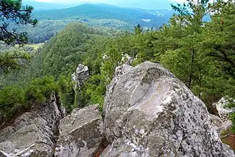 Monument Mountain is the name of a popular 503-acre (204 ha) open space reservation located in Great Barrington, Massachusetts on the southeast side of Monument Mountain. The reservation is centered on the 1,642 feet (500 m) subordinate summit of Peeskawso Peak. It is managed by The Trustees of Reservations, a non-profit conservation organization and is notable for its expansive views of the Housatonic River Valley, the Berkshires, the Taconic Mountains, and the Catskill Mountains of New York from the knife-edge summit of Peeskawso Peak.[1] Monument Mountain, composed of erosion resistant quartzite, is of The Berkshires geology. The reservation receives more than 20,000 visitors a year. The mountain was logged for charcoal to fuel a furnace in Vandusenville at the corner of Division Street and Route 41 in Great Barrington. Remnants of the furnace can be seen if one stands on the Route 41 bridge and looks upstream on the Williams River.
