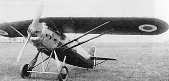 The landing gear conformed with the typical conventions of the company, such as its use of a pair of independent half-axles.[5] The struts of the landing gear were directly attached to the lower longerons of the fuselage via special pivoting joints that eliminated the danger of breaking one of the longerons if one of the struts were to buckle during a hard landing. The shock absorbers, which were located in the plane of the lateral V-shaped struts, consisted of a certain number of independent rubber loops that could be easily replaced; the entirety was fully enclosed within the covering of the front struts.[6] To facilitate ground manoeuvring, the pilot was able to control the orientation of the tail skid in a manner that was independent of the rudder. It was attached to the fuselage by two bolts.[7]