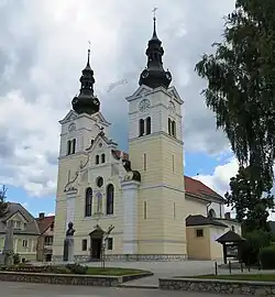 The parish church in the settlement is dedicated to Saint Martin and belongs to the Roman Catholic Archdiocese of Ljubljana. It is a Late Gothic building that was extended and restyled in the Baroque in 1740. Its 19th-century façade has two belfries.[5] Saint Martin's church was first mentioned in 1232 and was probably a small wooden structure. The current structure was built in 1895 and was designed by Raimund Jeblinger (1853–1937). The main altar features Saint Martin kneeling on a throne accompanied by two angels.[6]