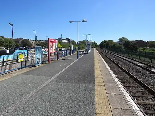 Morecambe is a railway station on the Morecambe Branch Line, which runs between Lancaster and Heysham Port. The station, situated 4 miles (6 km) west of Lancaster, serves the town of Morecambe in Lancashire. It is owned by Network Rail and managed by Northern Trains.
