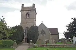 The churchyard has one war grave, that of a World War II Royal Air Force officer.[21] Immediately outside the churchyard stands the parish's war memorial, a stone Celtic cross commemorating dead of both World Wars. Around its base is Earl Haig's quotation: "By the long road they trod with so much faith and with such devoted and self-sacrificing bravery we have arrived at victory and to-day they have their reward."[20]